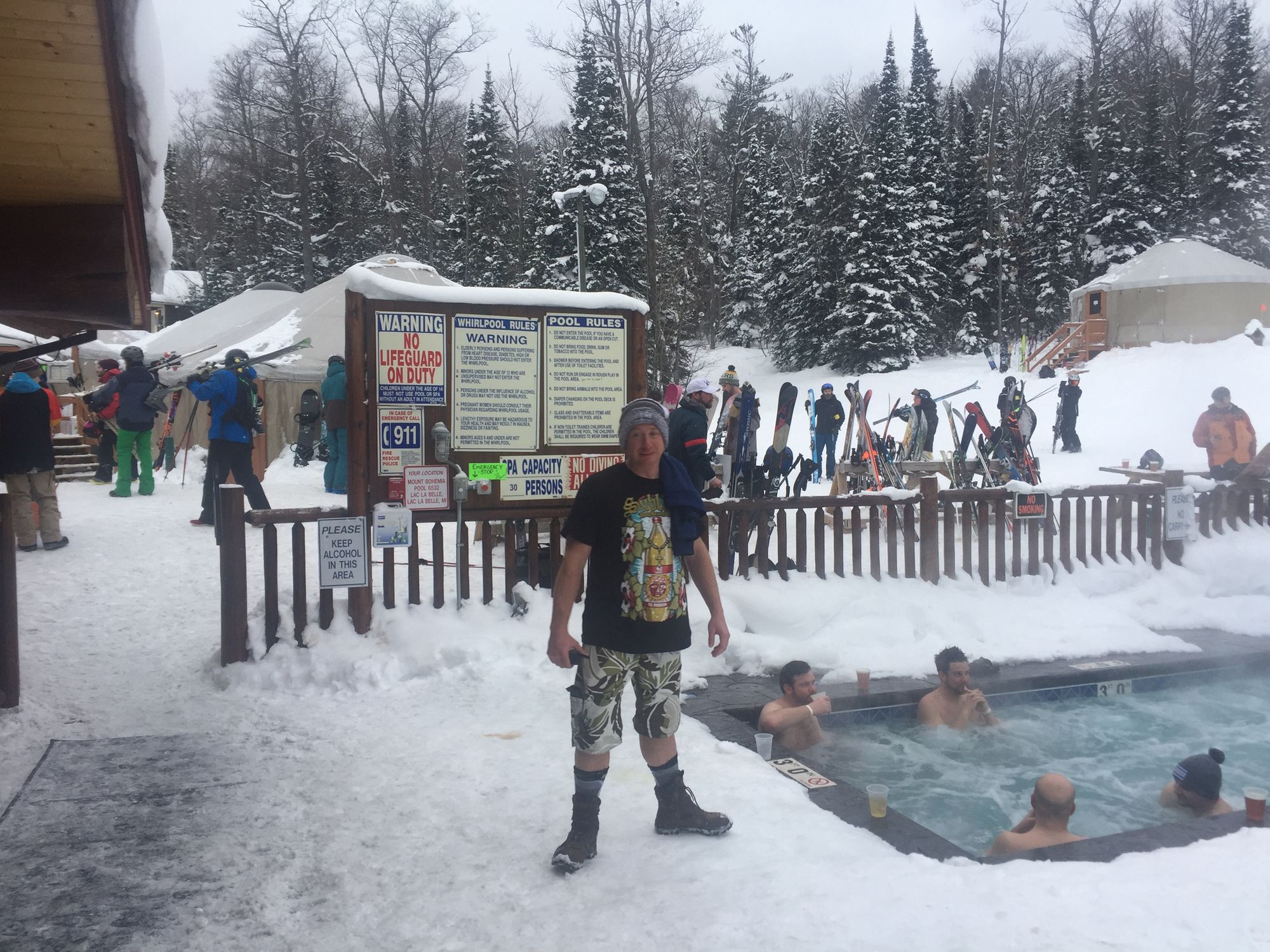 Upon our arrival, we walked into the bar in the only actual wooden building, right next to the hot tub into which persons wearing diapers may not enter. We saw a gentleman asleep on the couch with a ski jacket, no shirt, and his unbuttoned trousers still on, but ready, willing, and able to slip off. The four people standing with beers informed us that it was closed, and we’d better go to the other bar, in one of the yurts.