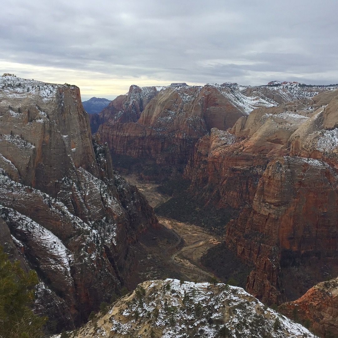 Our hike to Observation Point brought us along some chillingly sheer cliffs and through a claustrophobic, narrow slot canyon until we returned to the snow covered high plateau. A ranger had suggested, as at both Bryce and Arches, that we buy $25 crampons to help us cheat death on the icy trail. Though we had scoffed at this suggestion earlier, we went as far as to hold a pair each in our hands this time. Not to be parted with any cash, we backed off from the precipice and risked it, trusting our mountain-goat spryness.